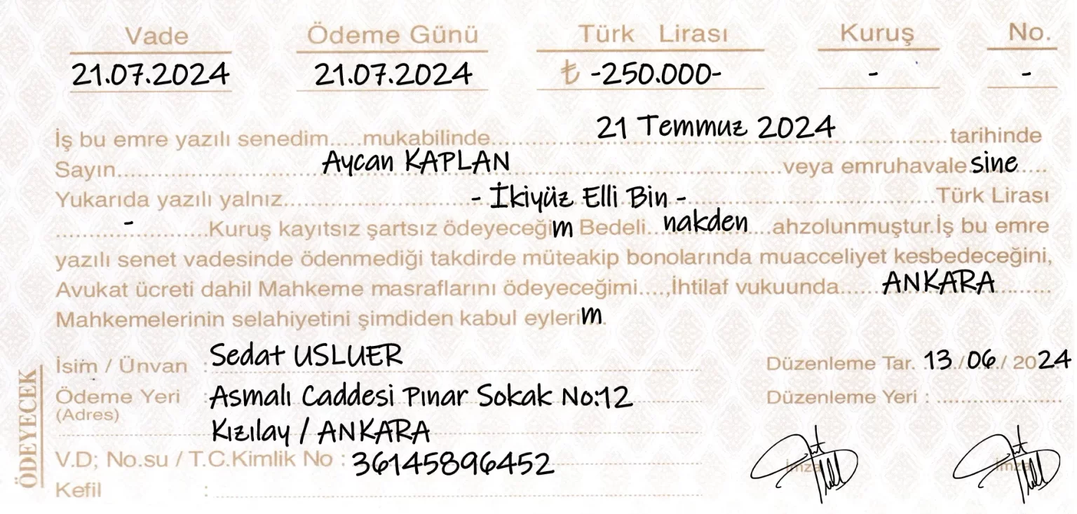 Senedin taahhüt altına alan tarafı, yani borçlu kişinin adı, soyadı ve adresi de senede açıkça yazılmalıdır. Bu bilgiler, senedin kime ait olduğunu kanıtlar niteliktedir.
